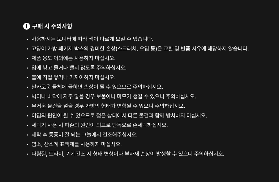 - 이염의 원인이 될 수 있으므로 젖은 상태에서 다른 물건과 함께 방치하지 마십시오.